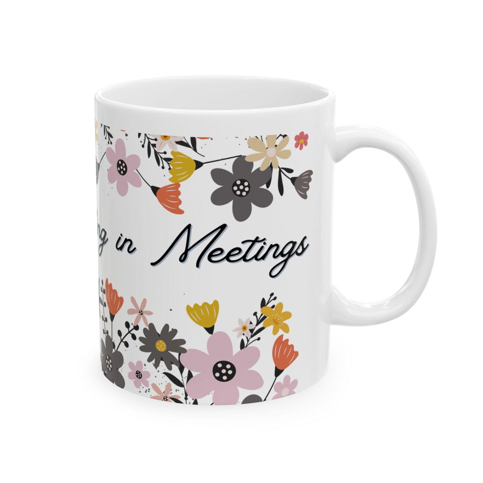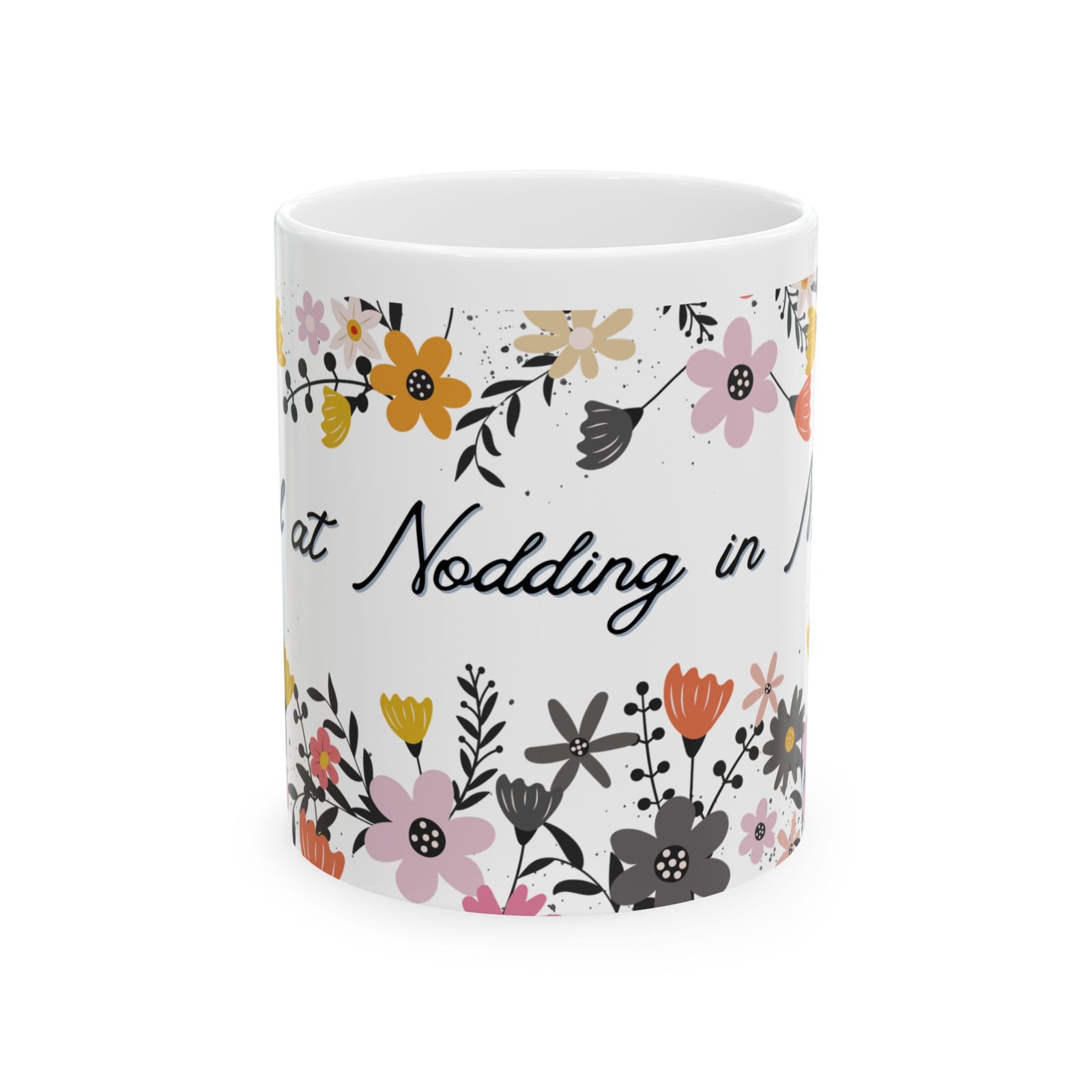 Enjoy a quiet moment of humor and comfort with this "I Excel at Nodding in Meetings" ceramic coffee mug. Designed for office professionals and coffee lovers alike, this funny office mug blends light sarcasm with a warm, calming aesthetic—perfect for desks, video calls, and daily work routines. The design showcases a soft floral border in warm peach, gentle pink, golden yellow, and charcoal tones, delicately wrapping around the glossy white ceramic surface. Hand-lettered typography flows like a friendly note, adding charm while letting the witty quote shine. Whether you’re enjoying your morning coffee or an afternoon tea break, this custom coffee mug turns everyday sips into a small, steady moment of calm and delight.