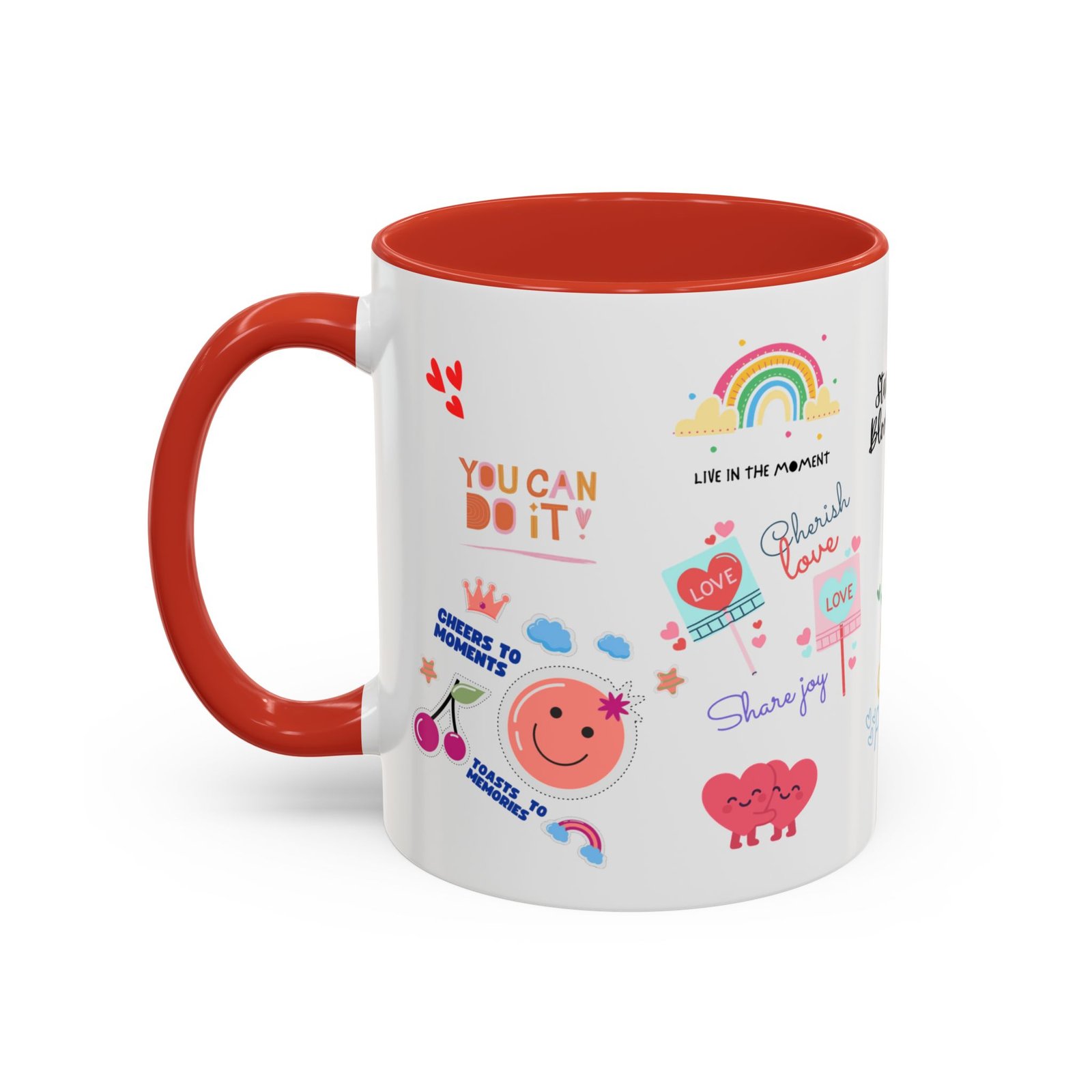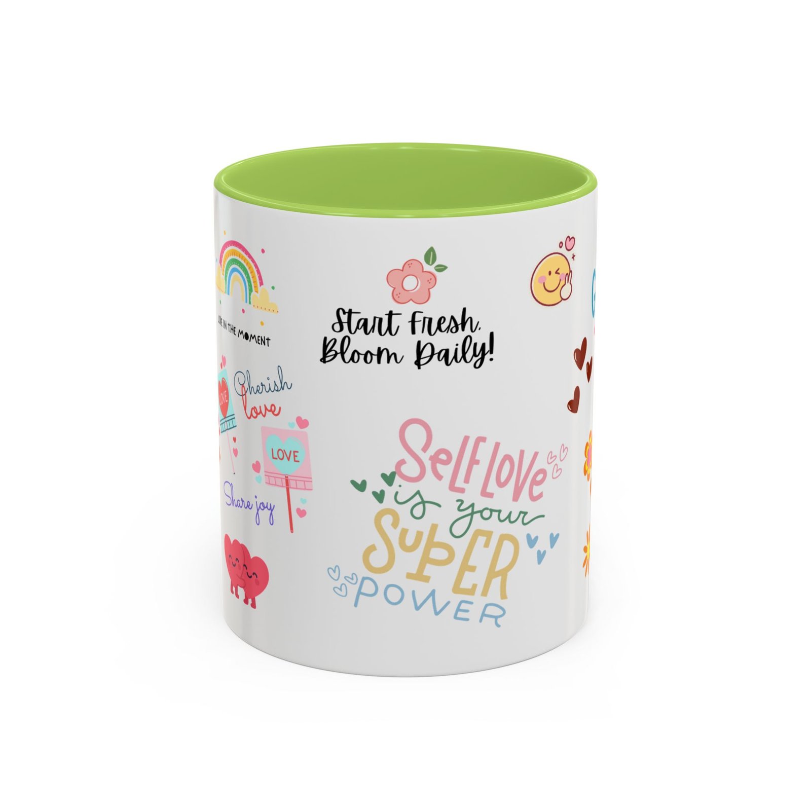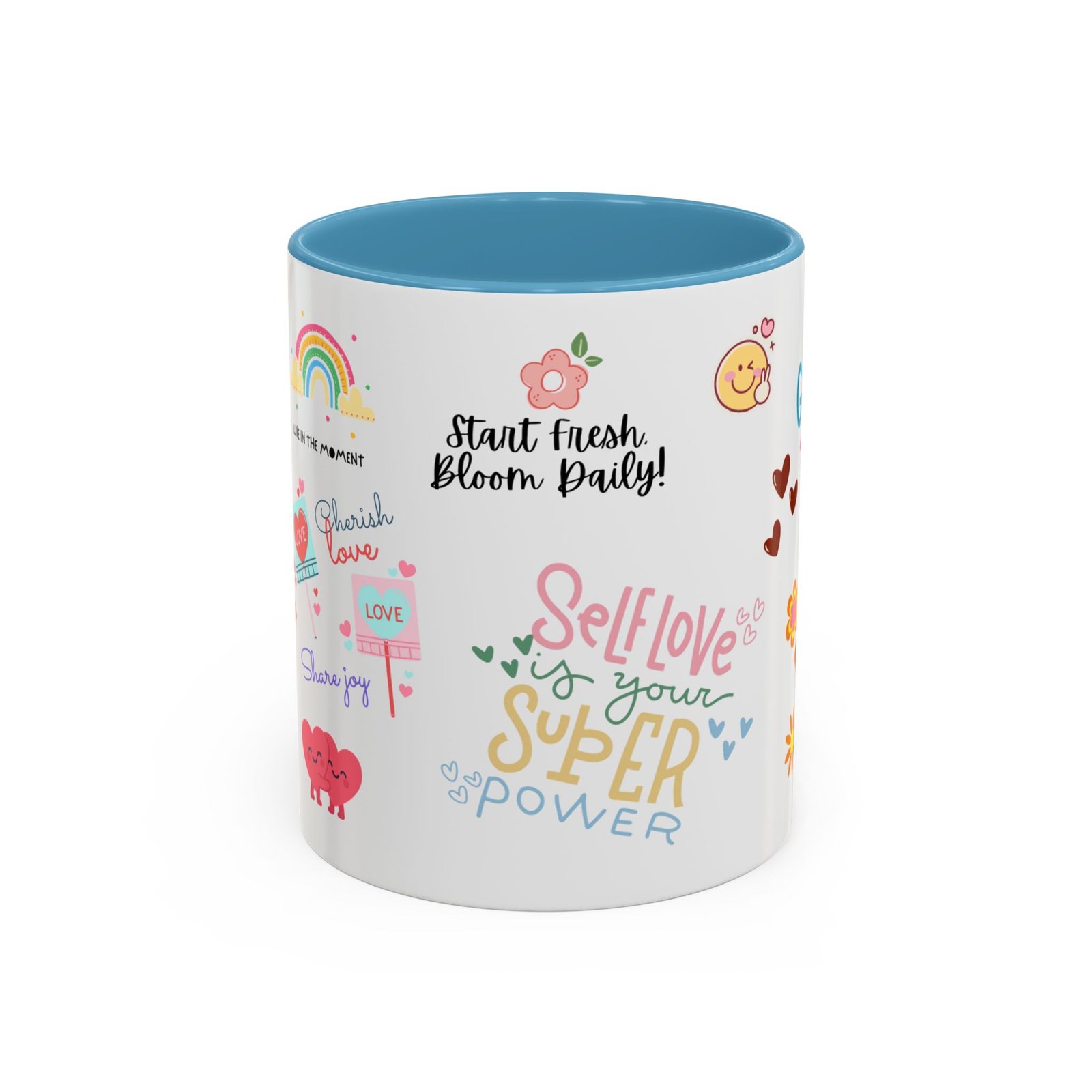 Start your day with a boost of confidence and color. This vibrant accent mug features a beautiful collage of uplifting hand-lettered phrases and playful doodles—including rainbows, smiles, hearts, and floral bursts—designed to brighten even the slowest mornings. Each sip becomes a mindful ritual: a warm cup of coffee paired with a gentle reminder to prioritize self-love, gratitude, and good vibes. Lightweight yet sturdy with a high-gloss finish, this mug features a colorful interior and matching handle that adds a cheerful pop of personality to your desk or kitchen shelf. It’s more than just a mug; it’s a mood-lifter and a conversation starter for your daily routine.