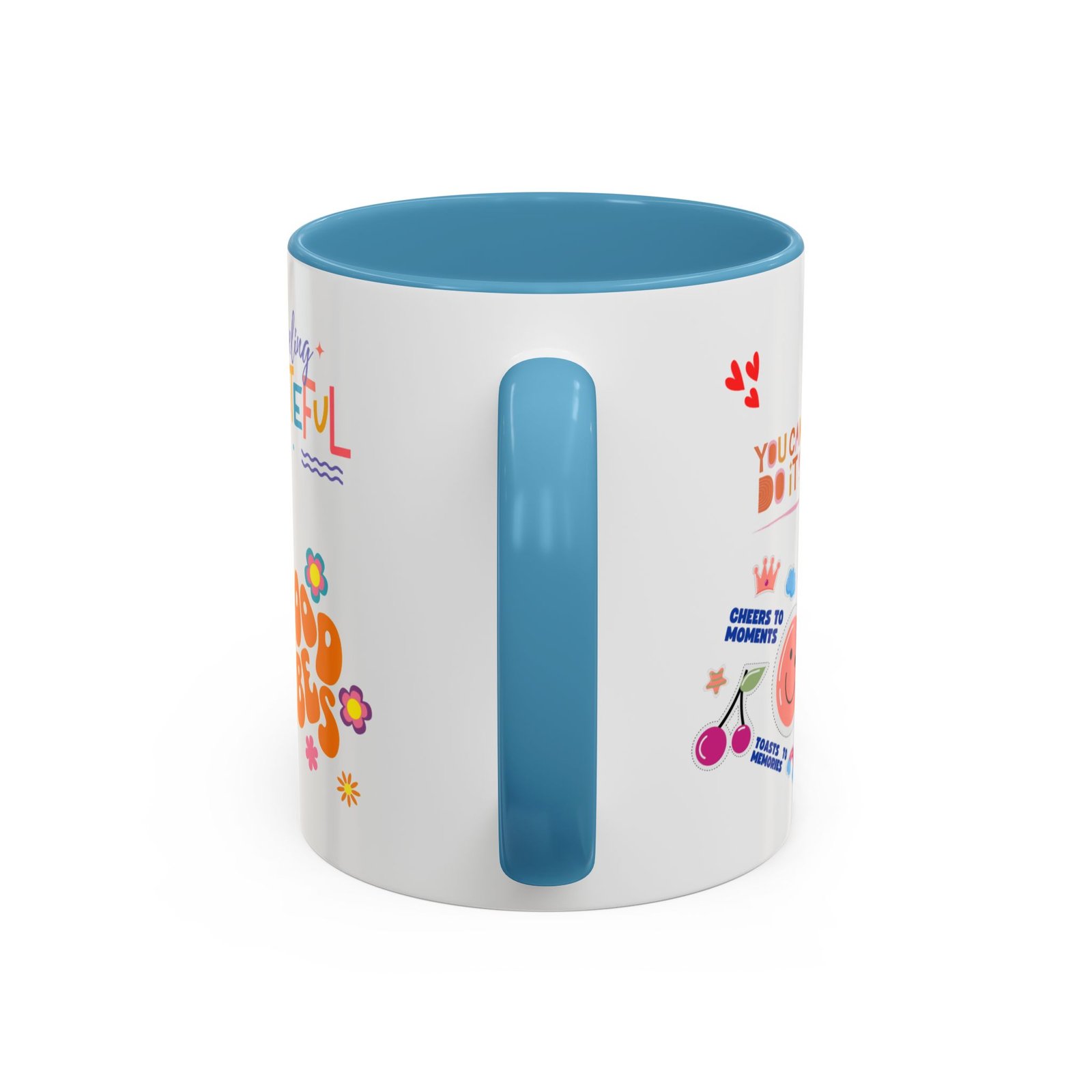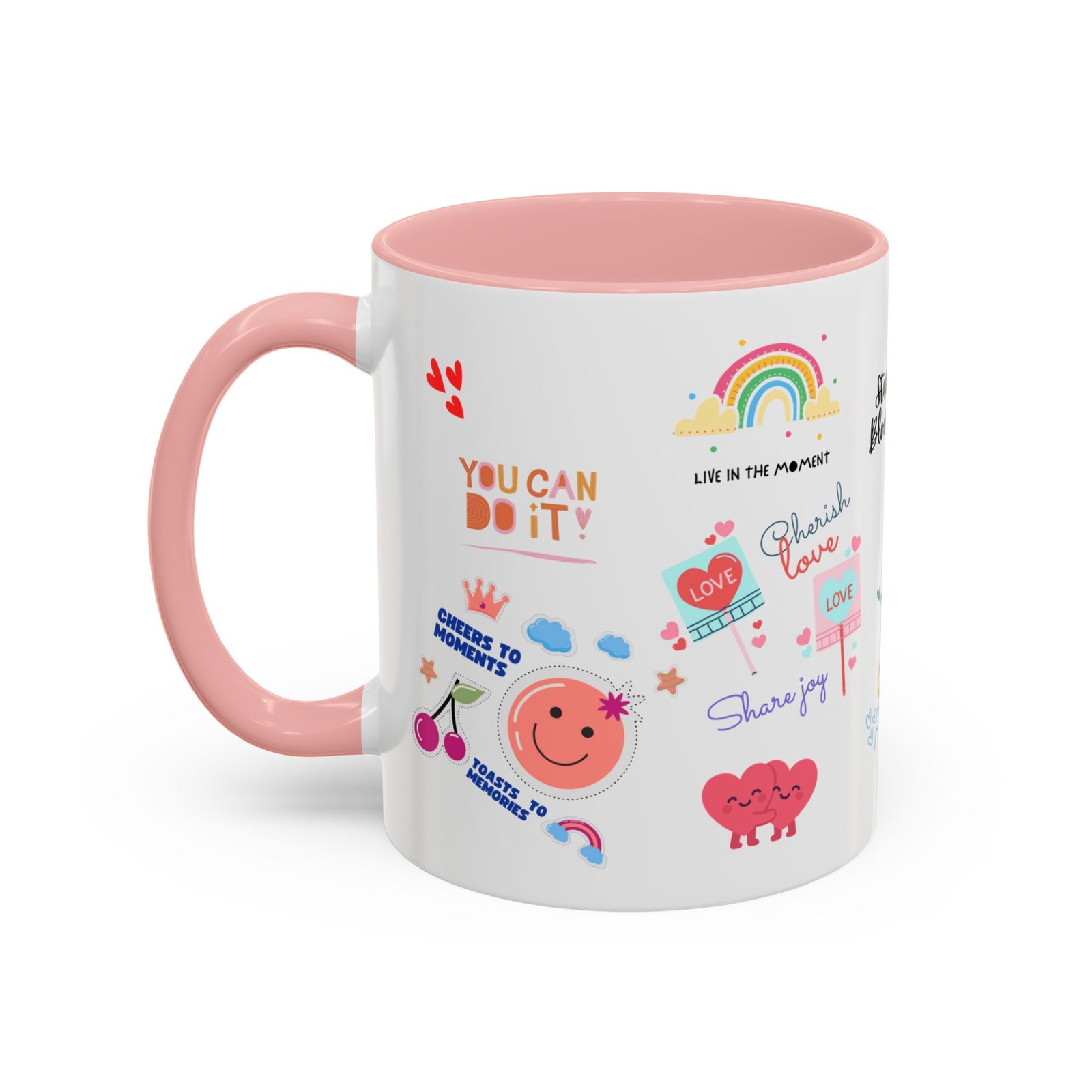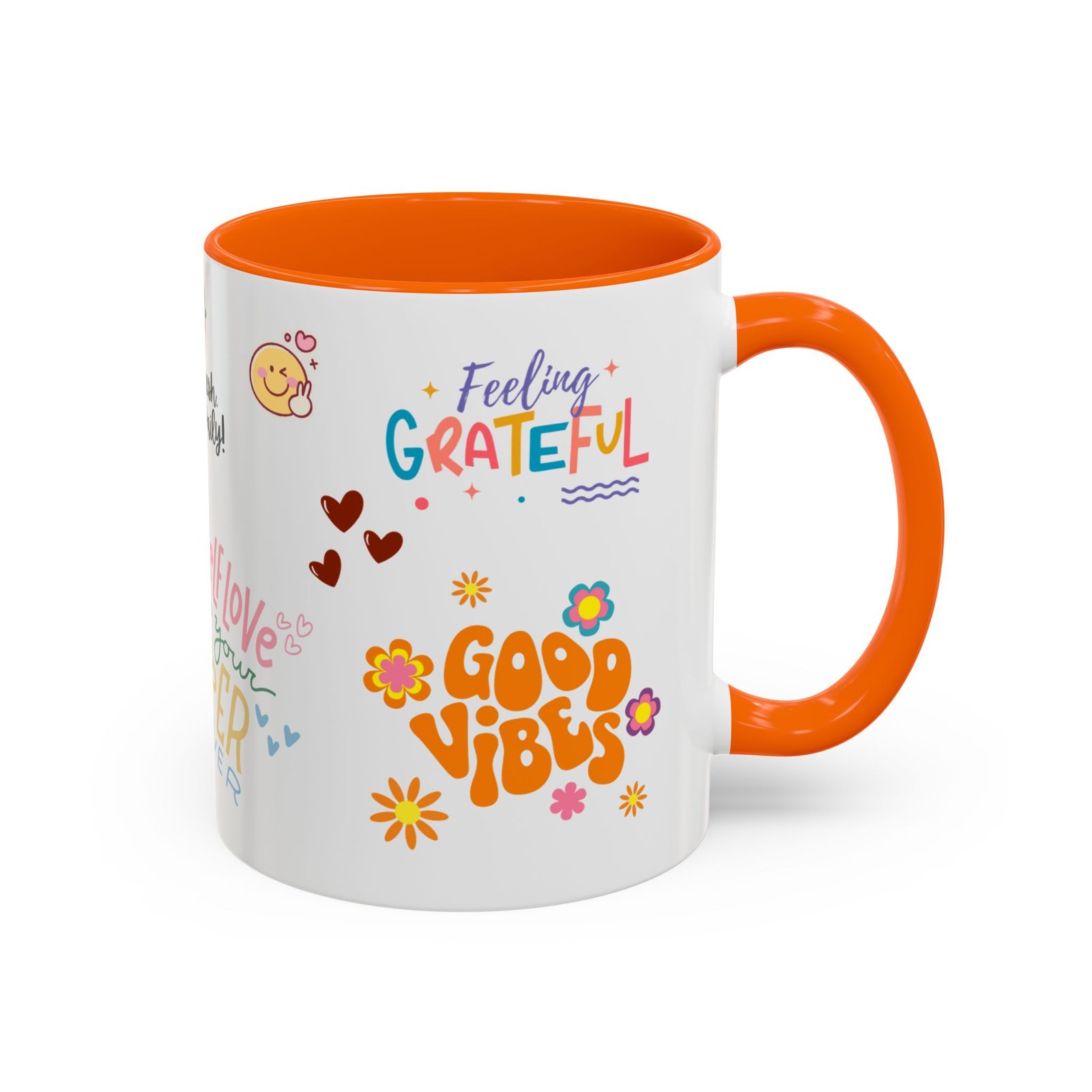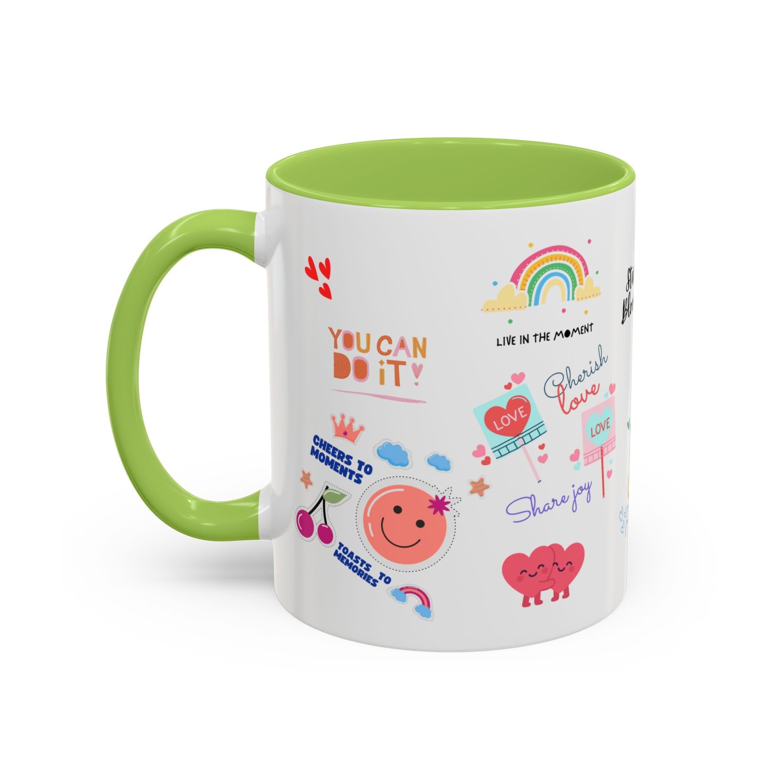 Start your day with a boost of confidence and color. This vibrant accent mug features a beautiful collage of uplifting hand-lettered phrases and playful doodles—including rainbows, smiles, hearts, and floral bursts—designed to brighten even the slowest mornings. Each sip becomes a mindful ritual: a warm cup of coffee paired with a gentle reminder to prioritize self-love, gratitude, and good vibes. Lightweight yet sturdy with a high-gloss finish, this mug features a colorful interior and matching handle that adds a cheerful pop of personality to your desk or kitchen shelf. It’s more than just a mug; it’s a mood-lifter and a conversation starter for your daily routine.