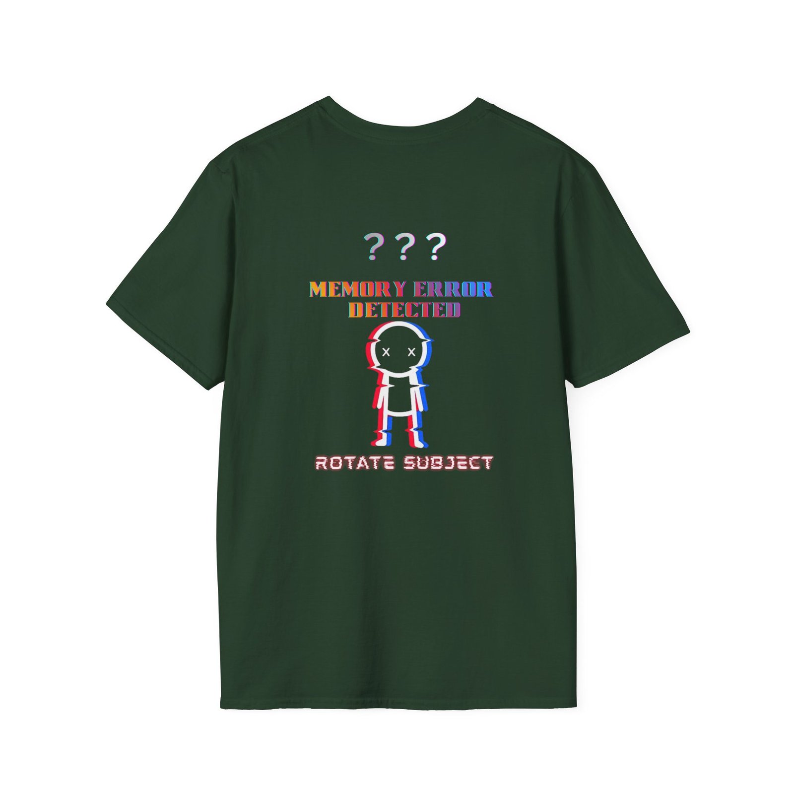 This softstyle tee channels surreal, glitchy nostalgia into wearable art. A vivid front print—an abstract, multi-faced head framed by swirling patterns and the bold headline “The Mandela Effect”—invites double-takes and late-night conversations. The back shows a playful, pixelated figure with “Memory Error Detected” and “Rotate Subject,” adding tongue-in-cheek techno-mystery. Lightweight and breathable, the shirt sits easily under a jacket or worn solo for streetwise layering. It’s for people who love mind-bending ideas, retro digital aesthetics, and conversation-starting graphics that hint at alternate memories and uncanny moments.