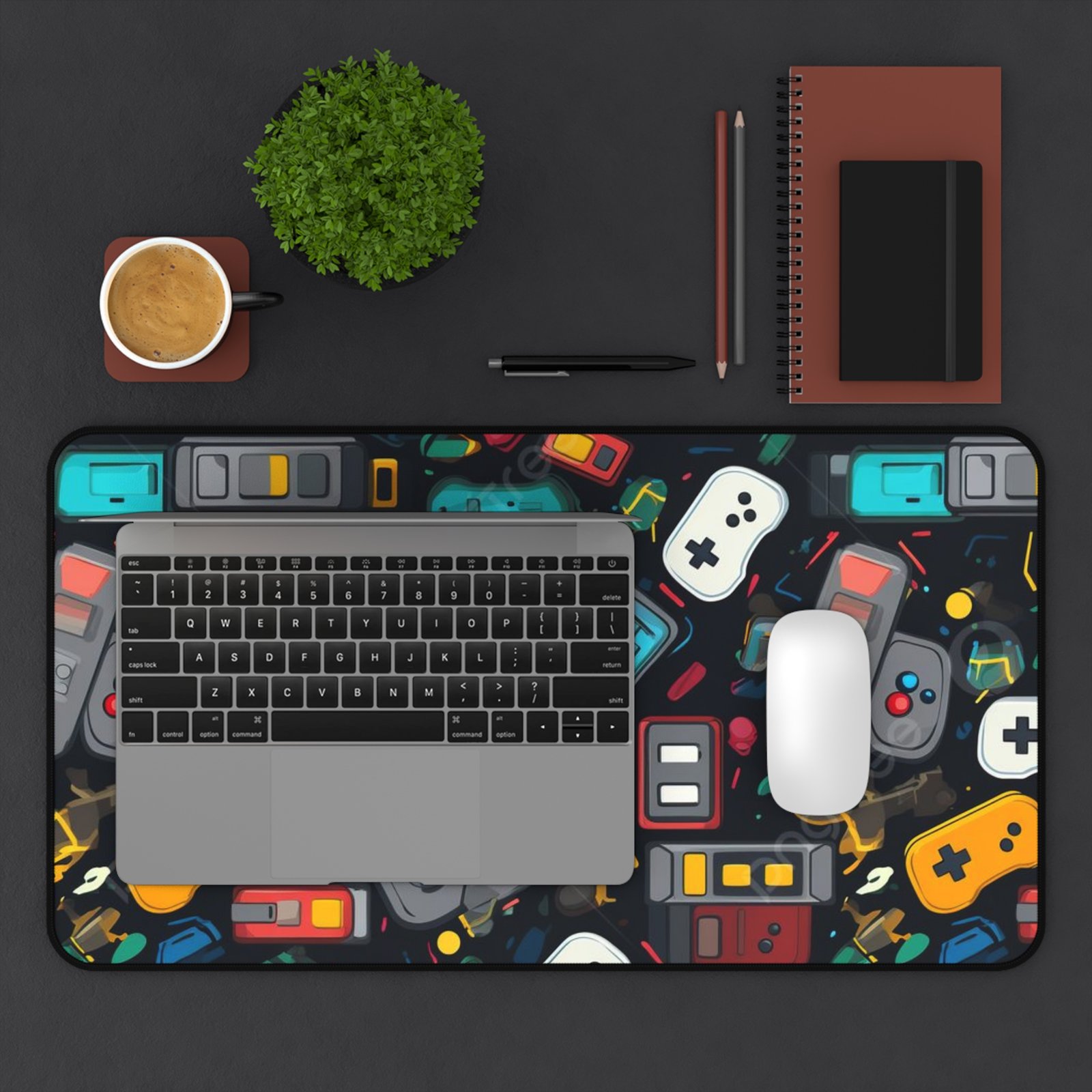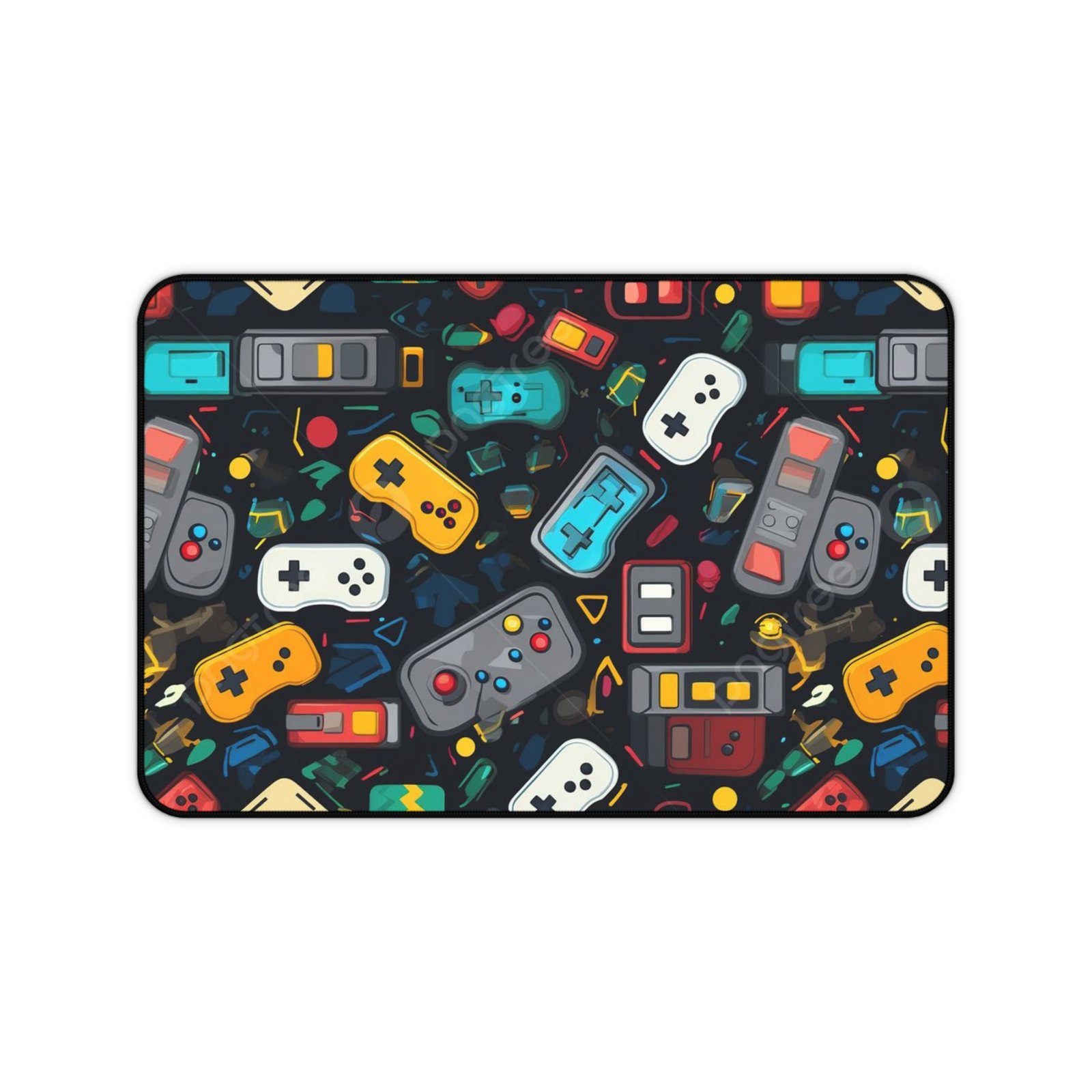 Bright, playful desk mat designed for gamers and creative workspace lovers. The neoprene surface features crisp, colorful illustrations of retro controllers and handheld consoles that bring a cheerful energy to your desk. It feels soft under your hands, stays put thanks to a textured anti-slip backing, and the stitched hem keeps edges neat after long hours of use. Use it as a smooth writing surface, a stable base for your keyboard and mouse, or a colorful backdrop for crafting and sketching sessions. Comes in three sizes to fit compact desks or full gaming setups.